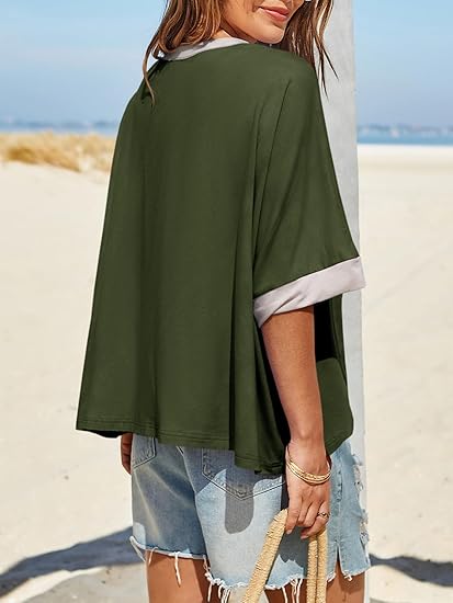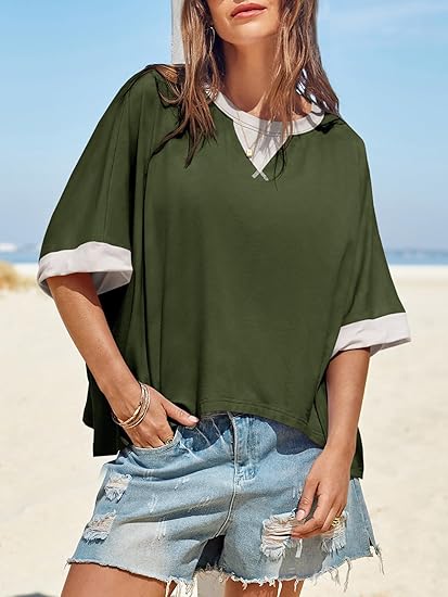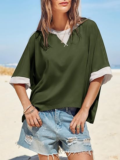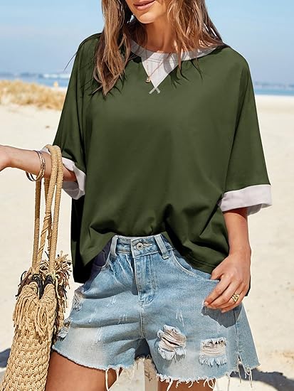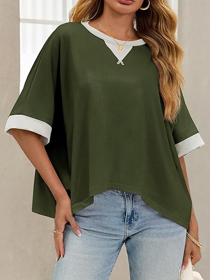 This army green top with white contrast trim brings a fresh twist to a casual staple. Designed with a loose, oversized silhouette, it offers both comfort and laid-back style. Made from 61% polyester, 33% cotton, and 6% elastane, the fabric is soft, breathable, and has just the right amount of stretch for easy movement.
