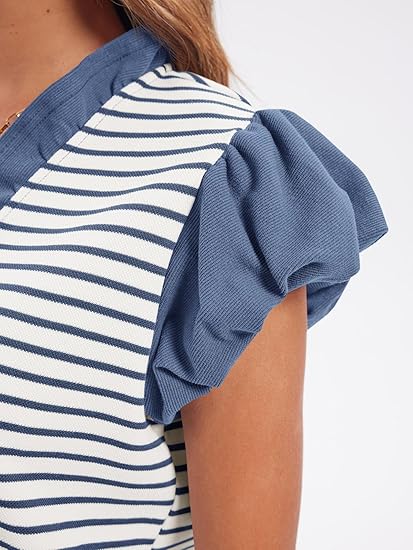 This striped T-shirt combines playful design with a touch of elegance. The classic navy and white stripes give it a nautical vibe, while the solid blue ruffle sleeves and V-neckline add a feminine twist. Its relaxed fit ensures comfort, making it a perfect piece for both casual outings and stylish everyday wear.