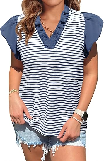 Perfect for beachside strolls, summer gatherings, or casual weekends. Pair it with denim shorts for a relaxed warm-weather look, tuck it into white trousers for a crisp nautical outfit, or accessorize with gold jewelry to enhance its chic details. This striped ruffle sleeve tee blends comfort with feminine charm for effortless style.