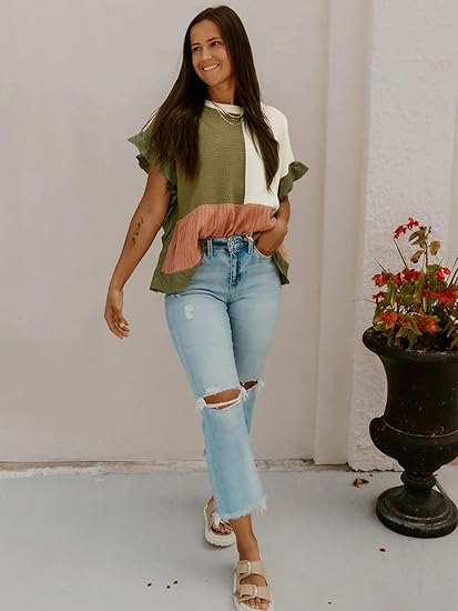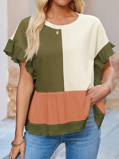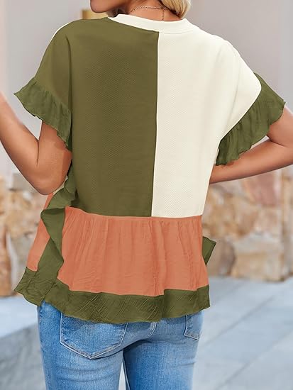 Perfect for casual outings, beach walks, or relaxed weekends. Pair it with jeans for a laid-back look, shorts for warm-weather styling, or layer it with accessories to emphasize the boho vibe. This color block ruffle tee is both comfortable and stylish, offering a unique twist on classic casual wear.