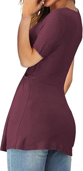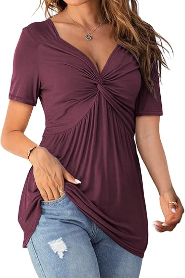 This wine red T-shirt combines comfort with a touch of elegance. The deep V-neckline and twist front design create a flattering silhouette, while the soft drape of the fabric adds a feminine flow. Its short sleeves and relaxed fit make it a versatile choice that can easily transition from casual outings to slightly dressier occasions.