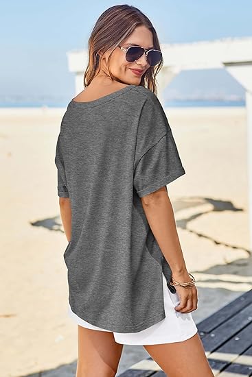 Perfect for casual outings, relaxed weekends, or travel days when comfort is a priority. Pair it with denim shorts and sneakers for a laid-back look, or tuck it into high-waisted trousers for a more polished yet casual style. This gray V-neck tee is an easy staple that adapts seamlessly to both relaxed and slightly dressed-up occasions.