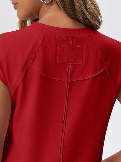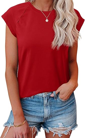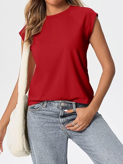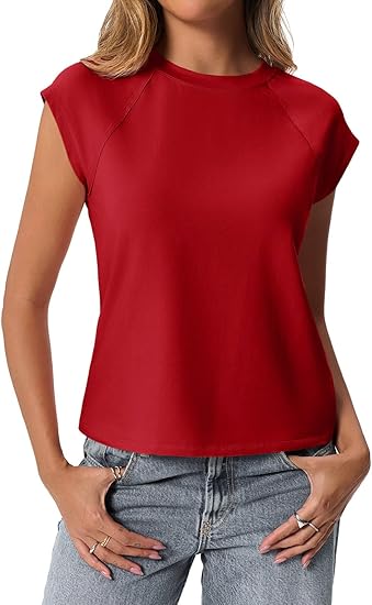 This red cap-sleeve T-shirt is a versatile wardrobe staple, combining simplicity and comfort. Made from a soft cotton blend with spandex for gentle stretch and breathability, it features cap sleeves that add a touch of femininity for a modern woman, while the crew neckline creates a timeless, easy-to-wear look.